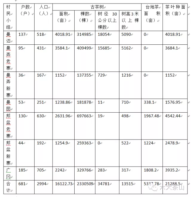 千百年來(lái),人們似乎對(duì)賀開(kāi)十分熟悉,卻又如此陌生。歷史仿佛為賀開(kāi)留下一段遺憾。讓我們看一組吸引眼球的古茶樹(shù)統(tǒng)計(jì)數(shù)據(jù)吧:曼邁314985棵、曼弄老寨409499、曼弄新寨137355、曼囡181878棵、邦盆老寨697663棵、邦盆新寨259363棵、廣岡329766棵,合計(jì)2330509棵。