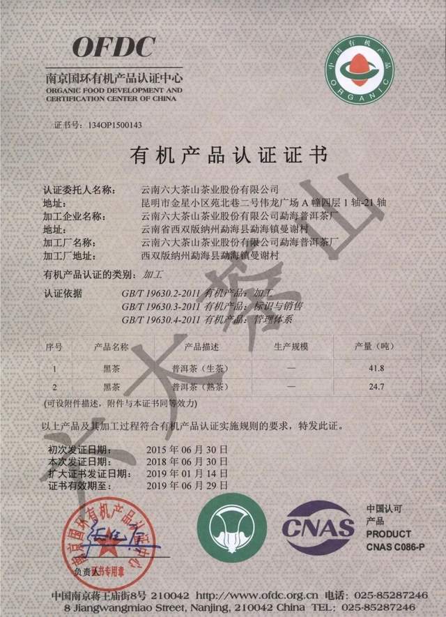 歷年來,六大茶山公司獲得國家有機(jī)食品認(rèn)證,通過SC認(rèn)證、食品出口衛(wèi)生注冊登記,云南省10大名品、云南省老字號、有機(jī)產(chǎn)品認(rèn)證企業(yè)、出口食品生產(chǎn)企業(yè)、中國茶葉行業(yè)百強(qiáng)企業(yè)、云南首批年份普洱茶質(zhì)量保薦溯源企業(yè)、云南首款曬青茶質(zhì)量保薦溯源企業(yè)、HACCP體系認(rèn)證企業(yè),通過ISO9001質(zhì)量管理體系認(rèn)證,ISO22000食品安全管理體系認(rèn)證。